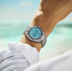 Su esfera azul con acabado degradado y patrón de rayos de sol refleja la luz de forma elegante, evocando la profundidad y el movimiento del océano. Los índices y agujas tratados con LumiBrite garantizan una excelente legibilidad en entornos con poca luz, mientras que el bisel giratorio unidireccional refuerza su funcionalidad como auténtico reloj de buceo.