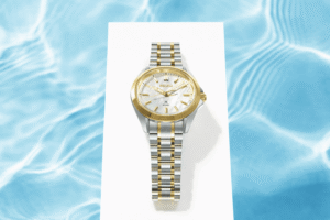 La caja de acero inoxidable, con un diámetro de 34 mm y un perfil fino de solo 8,9 mm de grosor, proporciona una presencia equilibrada y una gran comodidad en la muñeca. El conjunto se protege con un cristal de zafiro curvado, resistente a los arañazos y con una estética refinada. El diseño se completa con un elegante bisel y brazalete bicolor, que fusionan detalles en tono dorado con la sobriedad del acero inoxidable.
